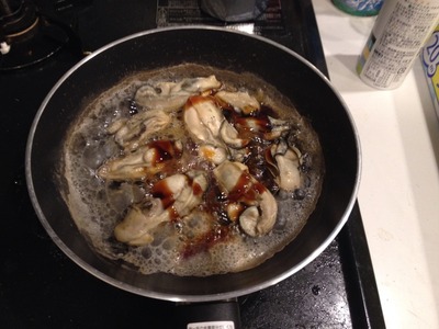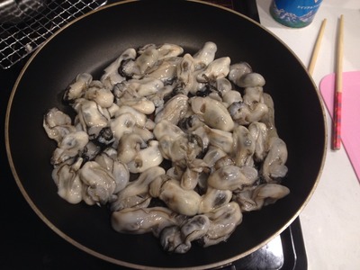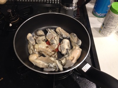 2.フライパンに牡蠣を並べ、強火にかけ3分ほど煮ます