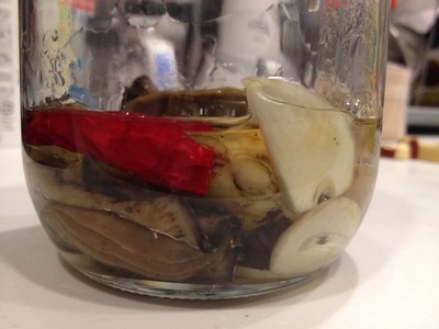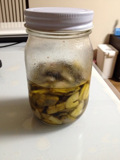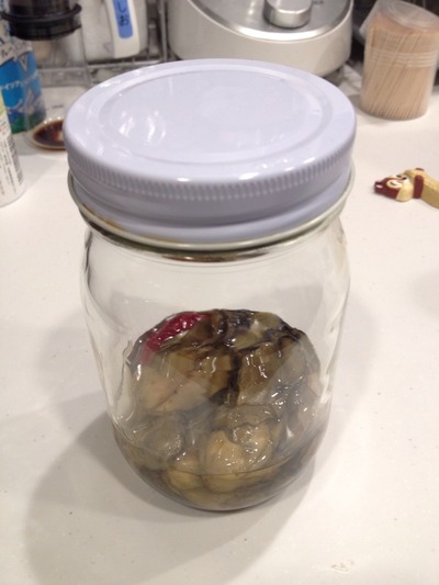 5.スライスしたニンニクと唐辛子と牡蠣を瓶にいれます