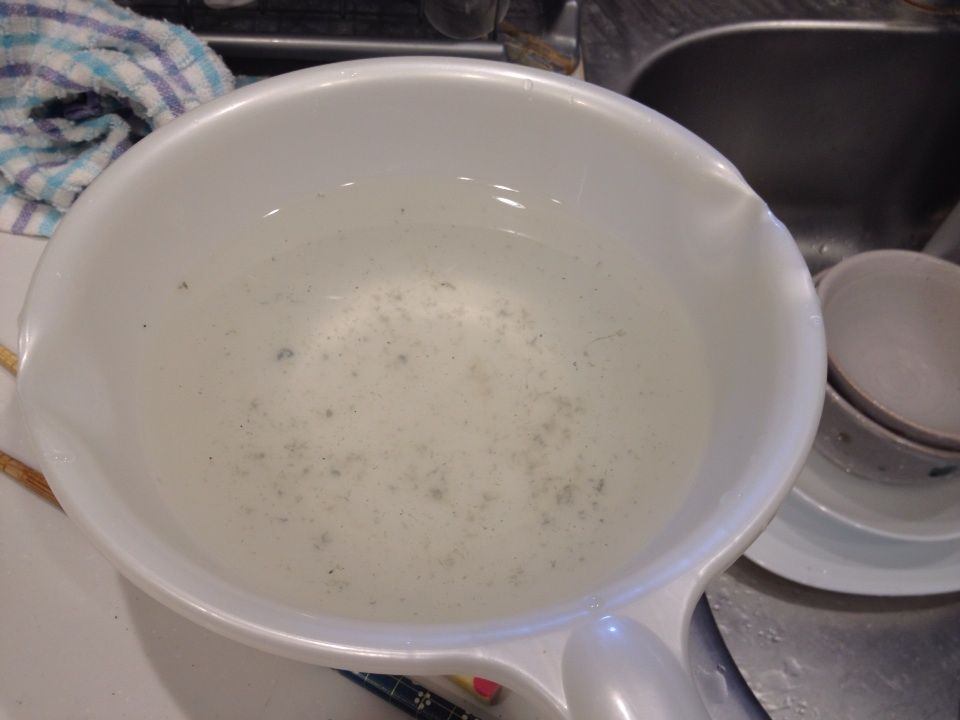 海水程度の塩水をつくり、牡蠣を洗います。塩水の中で揺らす程度で大丈夫。