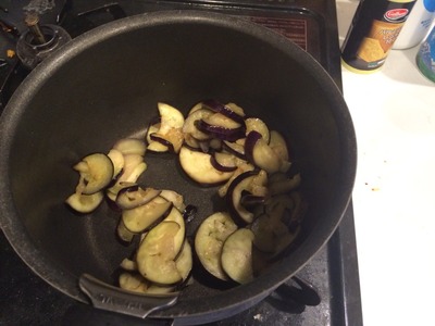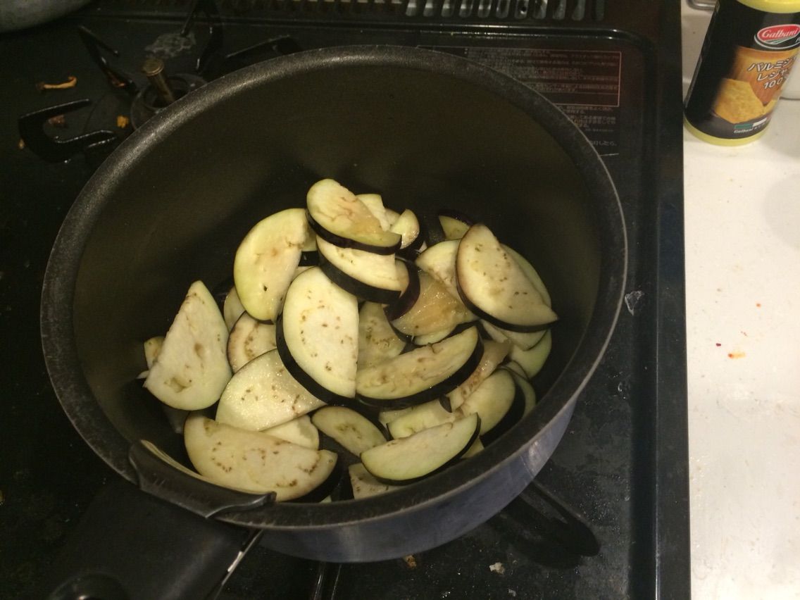 1.ナスを半月切りにし、鍋にゴマ油を引いて炒めます
