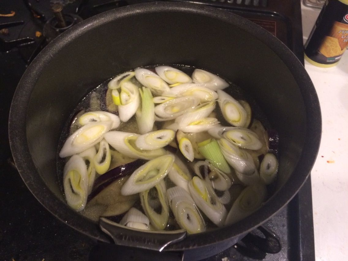 2.水と和風ダシを加えて、沸騰したら斜め切りにした長ネギを入れます