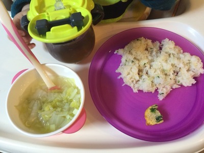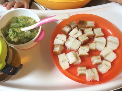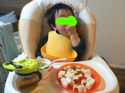 パンは自分で食べますが、スープは自分で飲めないので、スプーンで口に入れてあげます。